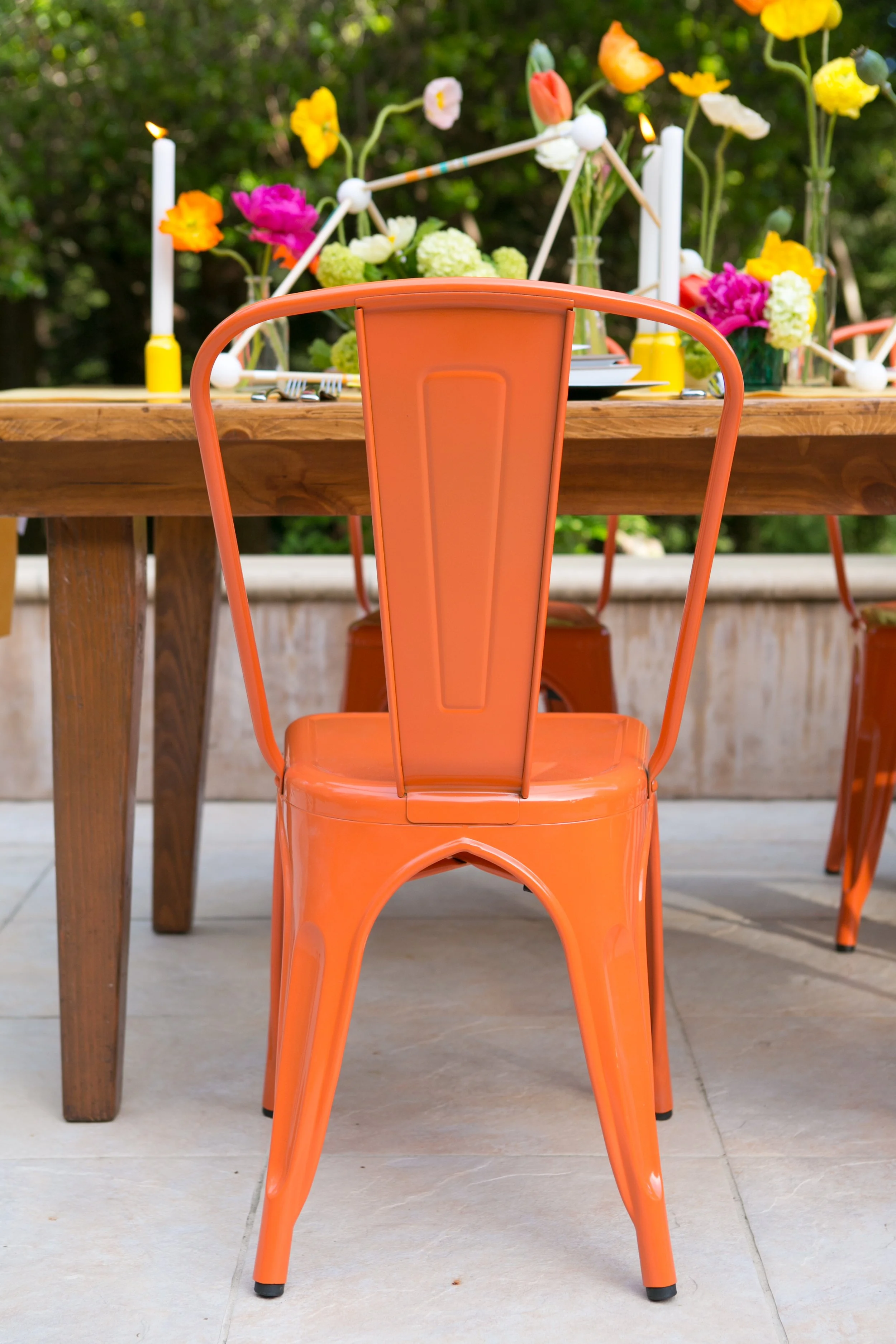 Inspired by our love for our home state, California, we dreamed up a Desert meets Redwoods meets Palm Springs shoot. We let the space inspire the design, which included saturated colors with a heavy emphasis on orange and teal. The centerpiece for the dinner table was a custom made wooden dowel and foam structure with poppies blooming out of every opening. We created a lemonade pairing bar where three different types of dessert accompanied the various flavored drinks. Perfect for staying hydrated in the glowing California sun. While the beautiful food grabs attention, you can’t miss the show stopping eight-foot by four-foot custom-designed pegboard backdrop with over 2,000 hand painted gold tees to create a one-of-a-kind art piece that doubled as a backdrop.